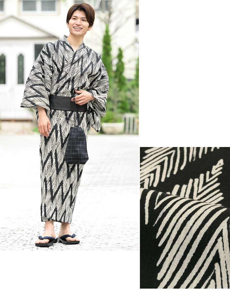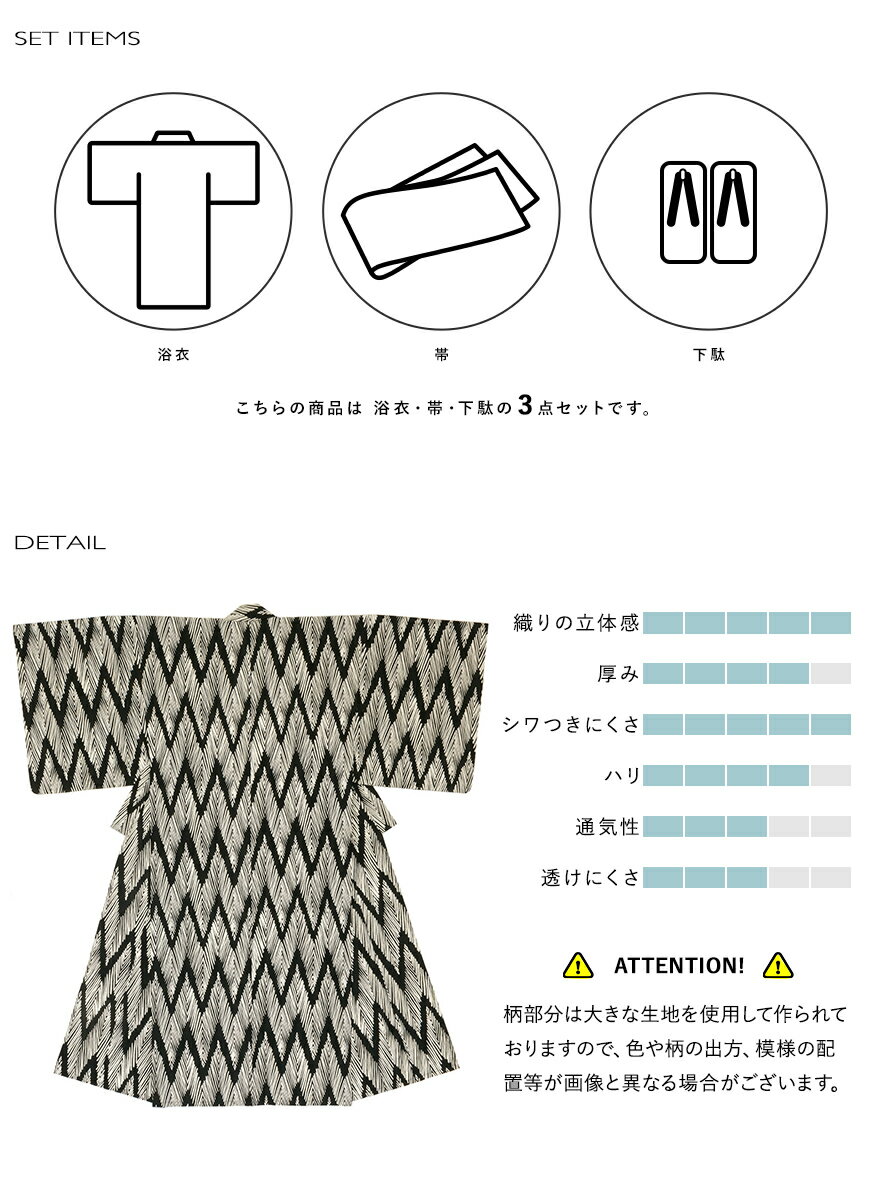 【10%OFF!~6/11 1:59】浴衣 セット メンズ 3点セット 黒系 ブラック 生成り 白 杉綾 ヘリンボーン 綿 変わり織り おしゃれ モイカ 夏 大人 男性 【Mサイズ】【Lサイズ】【送料無料】【あす楽対応】