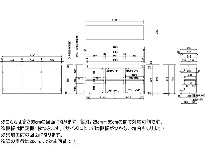 壁面収納 リビング 薄型 【送料無料】『耐震機能付リビング・書斎収納LIFE〔ライフ〕』上置き 梁対応奥行34cm幅120.5cm高さ26〜59cm扉付き ■□Op[■][代引き不可]!こちらの商品は代金引換はご利用頂けません!!